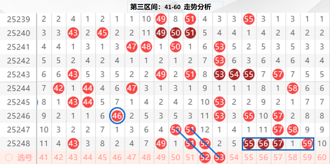 三区分析:【41-60】(走势图标注号码非小黄车大底,请谨慎参考,具体思路将在直播间分享讨论)