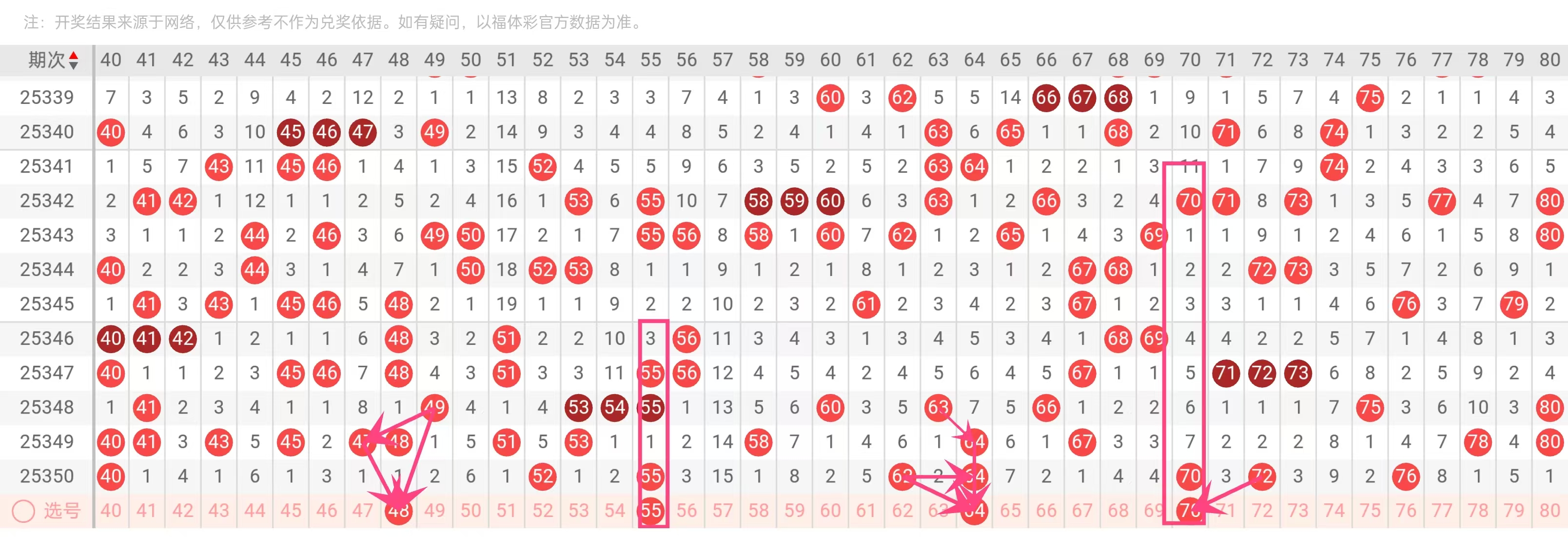 理由:近5期开奖中,40出现5次,为最高频号码之一,呈现极强的热态延续性。该号码在中大区(41-80)中属于“活跃中枢”,常与41、42、48等形成小范围连号或邻号组合,近期常出现在第4至第6个位置区间,具备较强的位置稳定性,可作为核心热号追踪。
