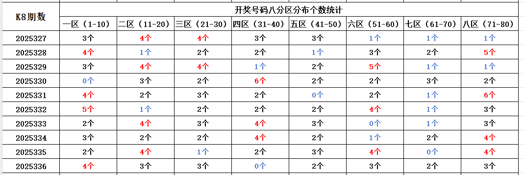 首先看上期回顾,“快乐8”第25336期开奖结果:1.6.8.10.11.13.20.26.27.29.41.43.54.55.59.61.62.71.76.80;通过分析开奖号码,分享第一个数据分析:统计开奖号码的八分区冷热走势,判断出号规律。以近10期开奖号码的八分区统计数据为例:
