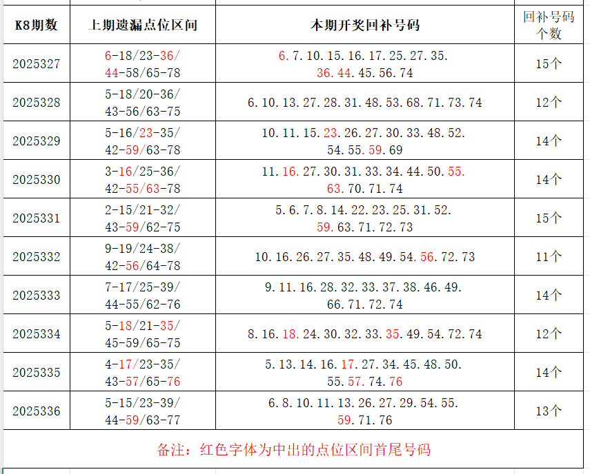 如图,上期的遗漏号码在下期开出10个左右,即为回补号码。定准点位区间首尾号码是关键!以上期2025336期为例,定位4个遗漏区间,围中13码!结合上期开奖号码,以跨度值大于或等于7为依据,本期关注4个遗漏区间:13-20/29-41/43-54/62-71;重点关注遗漏区间:2-14/21-36/42-56/60-75,区间遗漏号码可能在本期回补开出。注意区分遗漏区间回补号码和大底号码,不要混淆。个人分析,仅供参考。