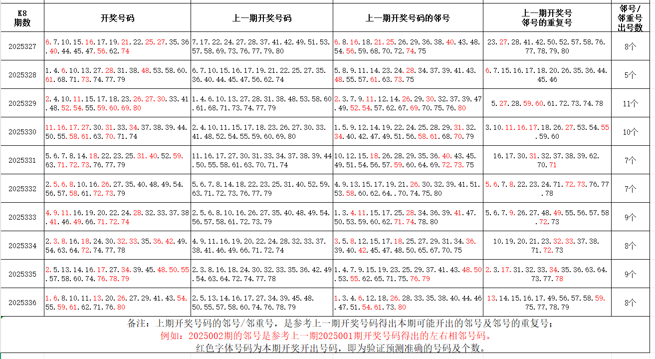 如图,红色字体是上期邻号、邻重号在下期开出,每期开出10个左右。上期邻号开出6个,邻重号开出2个。本期参考邻号:2.5.14.19.21.25.30.40.44.53.56.58.63.70.72.75.77.79;邻重号:7.9.10.11.12.26.27.28.42.54.55.60.61.62;个人分析,仅供参考。