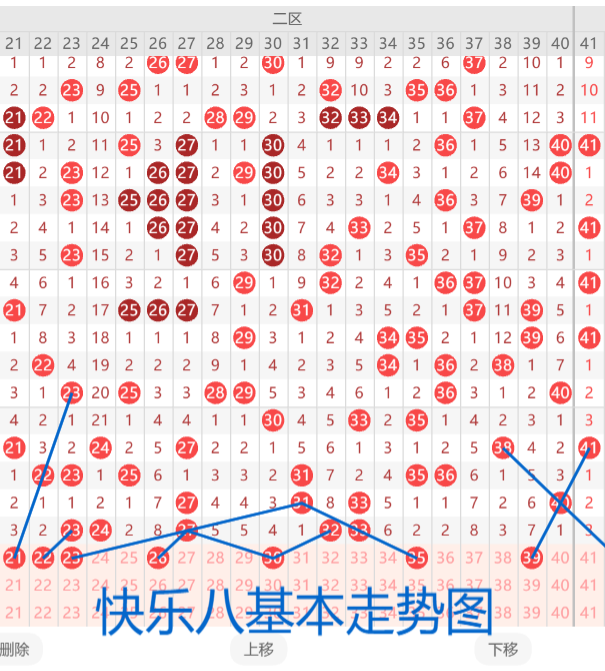 我们来看下二区的基本走势情况,上期开出了五枚开奖号码,本期预测二区有走高位的可能,预计开出7-8枚开奖号码,首先我们来看21的三斜连走势,以及23 24二连号的接替走势21 22 23考虑三连或者假三连的21 23形态。孤码27分边26 28或者三重。如果不考虑27走重,可以考虑27 30 的交替走势看30.35 39的三斜连走势形态建议二选一。
