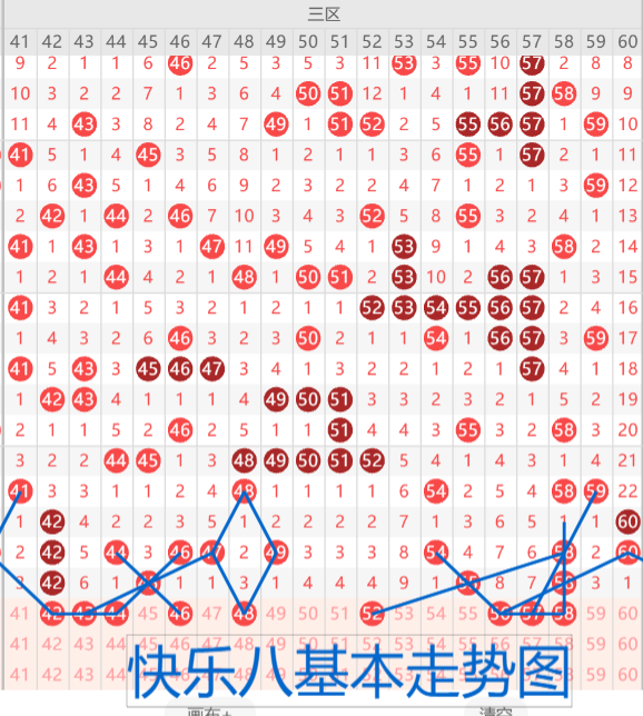 我们来看下三区的基本走势情况,上期开出四枚开奖号码,本期预测还是低位走势,建议考虑4枚开奖号码的3+1或者1+3形态,首先我们来看42 43 44的堵漏三连号和56 57 58的堵漏三连号,建议二选一。46,52的三斜连走势。48的梅花号,如果你选择42 43 44则配52,选择56 57 58则配46或者48二选一。