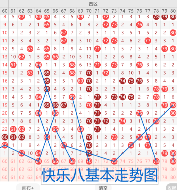 我们来看下四区的基本走势情况,上期开出了五枚开奖号码,本期预测四区还是在均值5枚开奖号码,首先我们来看62 64重码二选一。64 66的交叉走势建议二选一。68的三斜连走势。70的四重带三斜连走势。64 66 68 70四码建议四选二,73的双线三斜连。79 80二连开出考虑一重一分边的78 80建议双码同坐或者一个不要。