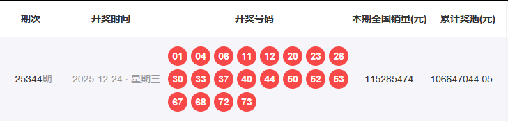 1、25344期开奖号码:01 04 06 11 12 20 23 26 30 33 37 40 44 50 52 53 67 68 72 73