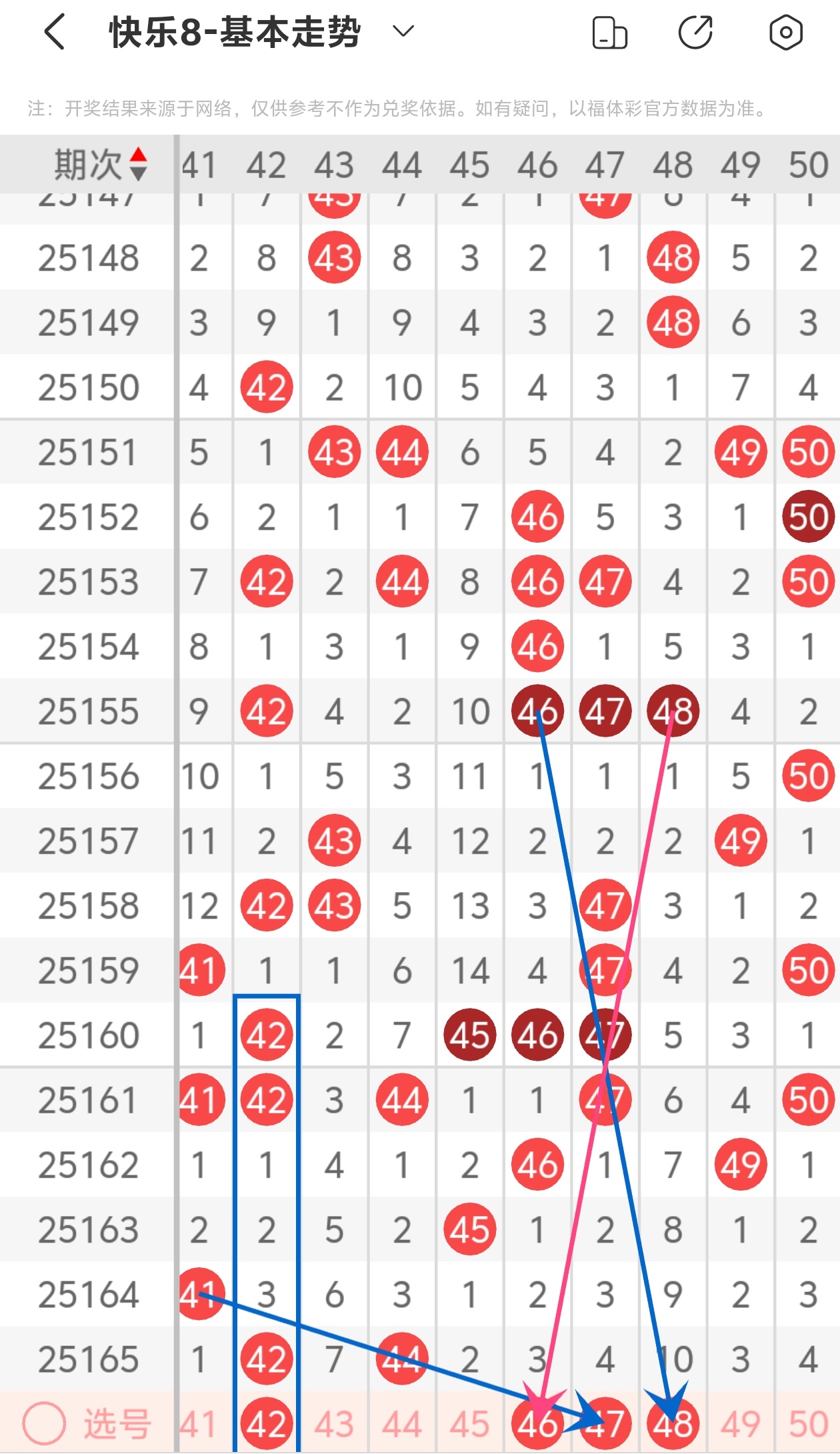 上期第五区间开出42 44,本期我们可以从上面走势图中看到选号的思路,本期推荐42 46 47 48