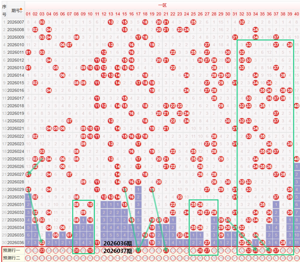 如图所示:在本期大数区的选号中注意在上期的走势中三区间开出了4枚中奖号码,目前保持着连续三期的低位走势,在上期的走势中,再次出现断5字头的走势,本期注意53 57的遗漏一期下方出现号码回补,前段位置注意44 45的夹二连走势,或者是考虑44 45二选一走势,四区间上期开出了8枚中奖号码,落位形态为连号为主,开出三组连号,本期注意74 75 76 77的位置向前走奇数走势69 71或者是考虑后段位置78的边号走势,前段位置在上期开出了63 64的错位二连走势,本期注意63 64的重号走势个人较为看好63的重号走势。