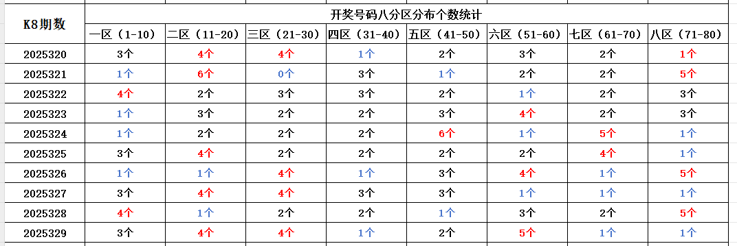 首先看上期回顾,“快乐8”第25329期开奖结果:2.4.10.11.15.17.18.23.26.27.30.33.41.48.52.54.55.59.60.69.80;通过分析开奖号码,分享第一个数据分析:统计开奖号码的八分区冷热走势,判断出号规律。以近10期开奖号码的八分区统计数据为例: