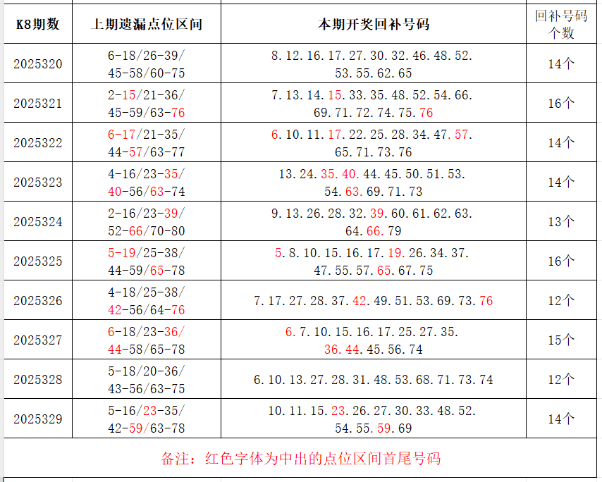 如图,上期的遗漏号码在下期开出10个左右,即为回补号码。定准点位区间首尾号码是关键!以上期2025329期为例,定位4个遗漏区间,围中14码!结合上期开奖号码,以跨度值大于或等于7为依据,本期关注4个遗漏区间:33-41/41-48/60-69/69-80;重点关注遗漏区间:3-16/25-36/42-55/63-78,区间遗漏号码可能在本期回补开出。注意区分遗漏区间回补号码和大底号码,不要混淆。个人分析,仅供参考。