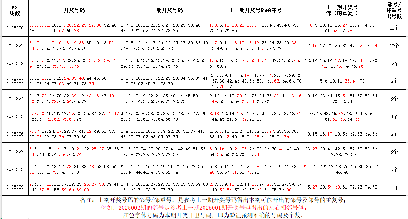 如图,红色字体是上期邻号、邻重号在下期开出,每期开出10个左右。上期邻号开出8个,邻重号开出3个。本期参考邻号:1.5.9.12.14.19.22.24.25.28.29.31.32.34.40.42.47.49.51.56.58.61.68.70.79;邻重号:3.10.11.16.17.18.26.27.53.54.55.59.60;个人分析,仅供参考。