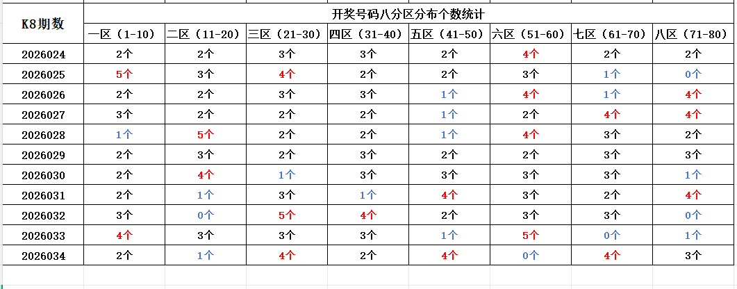 首先看上期回顾,“快乐8”第26034期开奖结果:4.6.19.25.26.29.30.31.32.43.44.48.50.62.65.66.68.71.72.80通过分析开奖号码,分享第一个数据分析:统计开奖号码的八分区冷热走势,判断出号规律。以近10期开奖号码的八分区统计数据为例: