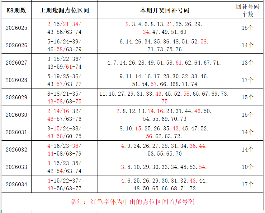 如图,上期的遗漏号码在下期开出10个左右,即为回补号码。定准点位区间首尾号码是关键!以上期2026034期为例,定位4个遗漏区间,围中17码!结合上期开奖号码,以跨度值大于或等于7为依据,本期关注4个遗漏区间:6-19/32-43/50-62/72-80;重点关注遗漏区间:5-18/24-36/45-59/63-79。点位区间号码和大底号码请勿混淆,个人分析,仅供参考。