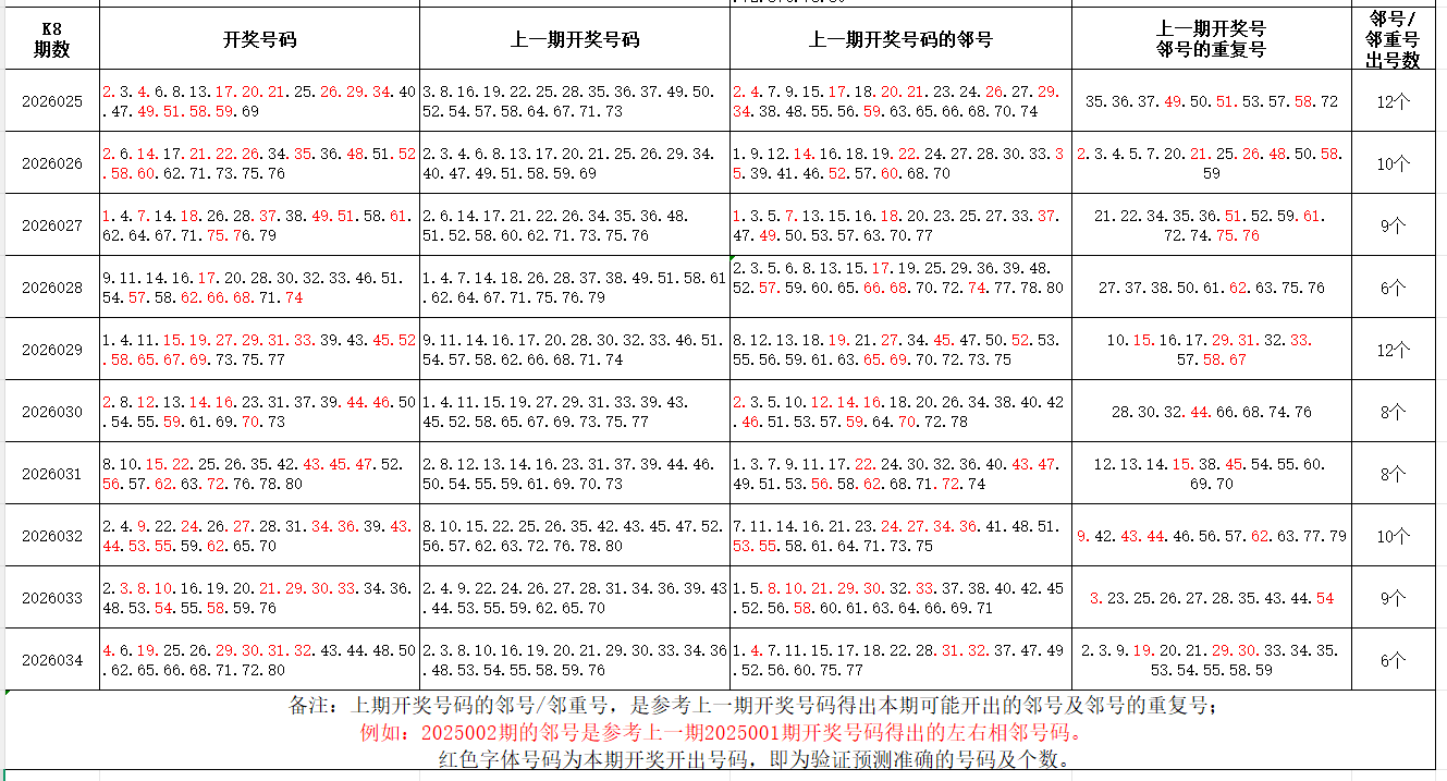 特别提示:关于邻号和邻重号的数据统计,邻号,是指上期开奖号码的左右相邻号码;其中重复出现的邻号,即为邻重号。一定要区分,邻重号不是上期开奖号码的重号,是邻号里的重号。统计方法不同,得到的数据结果不同。个人分析,仅供参考。