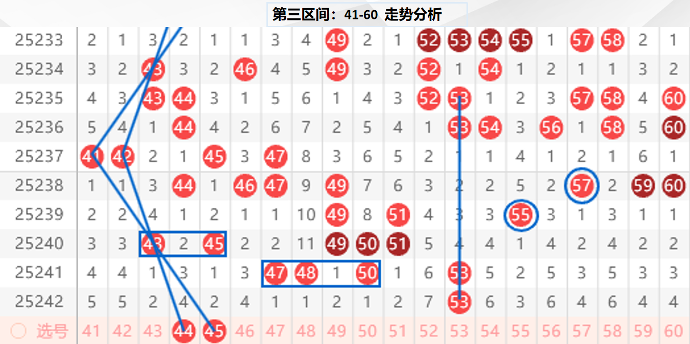 三区分析:【41-60】(走势图标注号码非小黄车大底,请谨慎参考,具体思路将在直播间分享讨论)