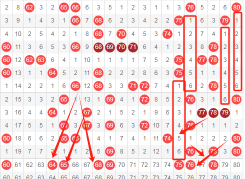 今日七区号码建议参考65隔期斜连,防64 65对子号开出,七区后区建议参考68的隔二斜连回补,防68 69对子号开出,八区号码建议参考75的分边号开区,防守76走重,防75 76对子号开区、防78号走重。七区八区推荐号码60 64 65 68 69 75 76 78