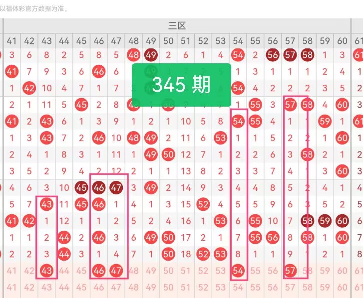 上期第三区间开奖4个号码,本期重点补充奇数。43是41-45段的奇数,作为区间起始段的关键号码,能填补上期41-45段的出号空白,为区间出号奠定基础;46是46-50段的偶数,上期该段有50一枚号码,46的加入可丰富该段的数值选择,同时与43形成奇偶搭配;47是46-50段的奇数,进一步强化奇数补充,与46、50形成数值梯度;54是51-55段的偶数,上期该段有52、53两枚号码,54作为相邻数值,能衔接上期出号趋势;57是56-60段的奇数,填补该段上期的出号空缺,完善上期出号集中的问题。