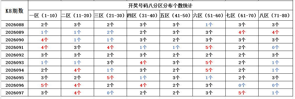 首先看上期回顾,“快乐8”第26097期开奖结果:4.5.8.12.14.16.17.35.37.43.46.54.56.58.62.66.68.69.70.74通过分析开奖号码,分享第一个数据分析:统计开奖号码的八分区冷热走势,判断出号规律。以近10期开奖号码的八分区统计数据为例: