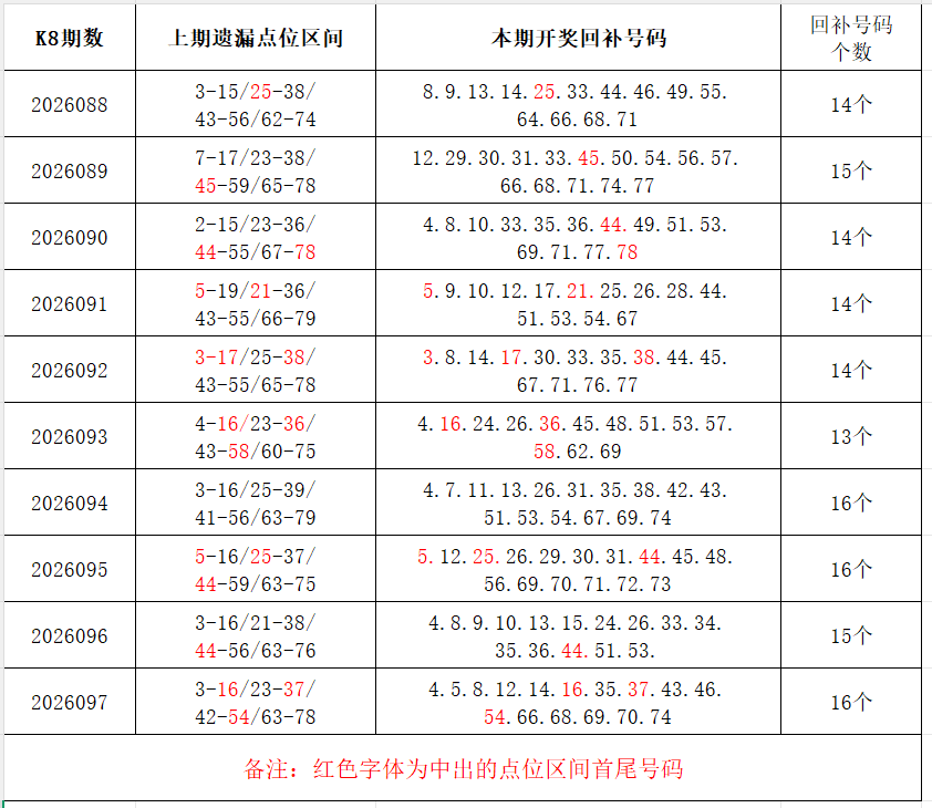如图,上期的遗漏号码在下期开出10个左右,即为回补号码。定准点位区间首尾号码是关键!以上期2026097期为例,定位4个遗漏区间,围中16码!结合上期开奖号码,以跨度值大于或等于7为依据,本期关注2个遗漏区间:17-35/46-54;重点关注遗漏区间:6-18/25-36/42-57/62-75。点位区间号码和大底号码请勿混淆,个人分析,仅供参考。