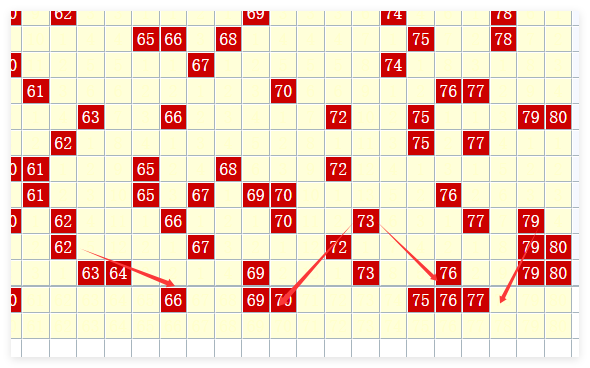 第四区【61-80】 上期7枚奖号。分析发现,该区近期有回补趋势,本期可能开出3-4个号码,重点关注60、69、74 75、78等号码。