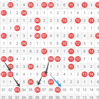 上图是福彩快乐8开奖号码其中一部分走势图,我标注出来的数字03,06看上面标注出来的黑色小箭头都是隔一期的斜连号码,我标注出来的数字09看上面蓝色小箭头是斜连号码,这里三个数字03 06 09。
