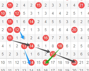 上图是福彩快乐8开奖号码其中一部分走势图,我标注出来的数字20看黑色小箭头是隔三期的斜连号码,我标注出来的数字14看蓝色小箭头是隔一期的斜连号码,我标注出来的数字16看绿色小箭头是斜连号码,这里三个数字16 20 14。