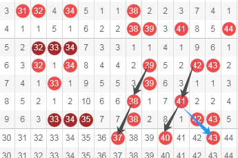 上图是福彩快乐8开奖号码其中一部分走势图,我标注出来的数字37和数字40看上面标注出来的黑色小箭头是隔一期的斜连号码,我标注出来的数字43看上面蓝色小箭头是斜连号码,这里三个数字37 40 43。