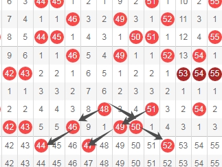 上图是福彩快乐8开奖号码其中一部分走势图,我标注出来的数字44 47 52看上面走势图中标注出来的黑色小箭头都是隔一期的斜连号码,这里三个数字44 47 52。
