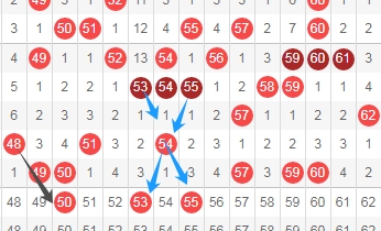 上图是福彩快乐8开奖号码其中一部分走势图,我标注出来的数字53 55这两个数字看上面标注出来的蓝色小箭头都是隔一期斜连号码,标注出来的数字50看黑色小箭头是斜连号码,这里三个数字50 53 55。