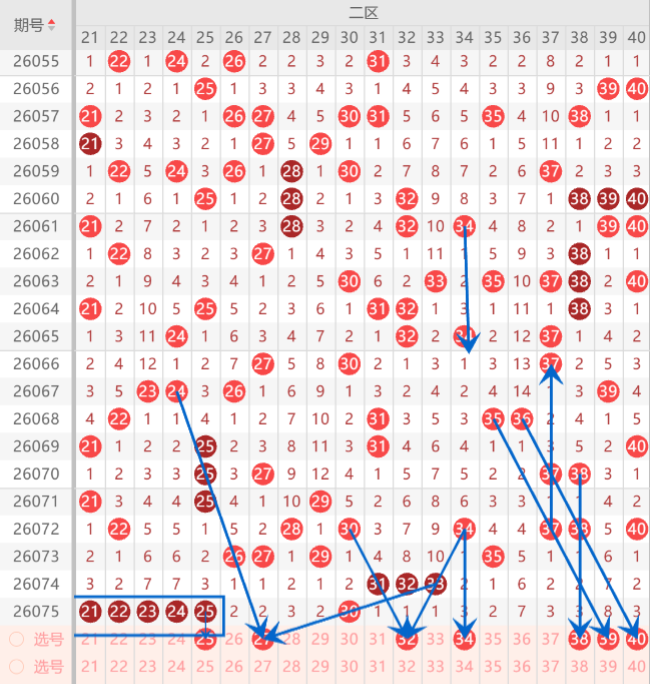二区间注意打底号21.25.27.32.34.36.38.39.40中关注3-4码开出机会,