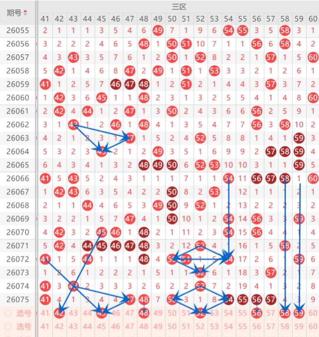 而三区的打底号是43.45.48.49.54.56.57.60中参考3-4码开出机会,