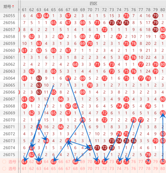四区在近期的走势上来判断机会的话,整体区间开出走热形态,上期四区间开出了2码,而且上期区间开出的形态是重码走势和空位回补走势,上期小妹在文章中布局到了2码开出,那么本期四区间我们重点关注的形态是空位回补,重码回补,那么本期首先注意空位回补上的65.66.68.中选择1-2码回补机会,而重码回补上注意74.75.80中防守一码回补机会,至于对称形态上的63.76.77中参考1码开出机会,上期重点关注在空位回补上布局到了1码开出,那么本期重点关注在重码走势上布局一码订胆机会,如图所示