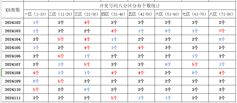 通过分析开奖号码,分享第一个数据分析:统计开奖号码的八分区冷热走势。上期开奖号码走势较热的区间:四区,走势较冷的区间:五区、六区,其它区间平分秋色,区间开出2-3个号码。以近10期开奖号码的八分区统计数据为例: