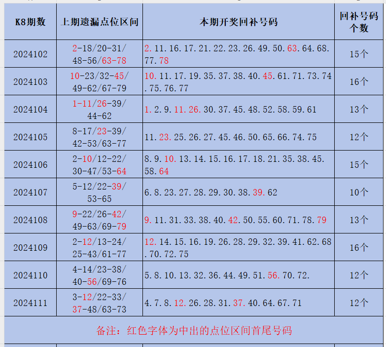 敲重点:定位回补点位区间,是推测回补号码的范围,不是区间内所有的号码都当做大底号码。何为点位区间?就是看好这个区间可能出号。综合每期数据的变化,区间冷热走势的变化,定位的回补点位也在随之变化。每期推荐3-4个回补区间,重点关注区间内的上期遗漏号码,可能在本期回补开出。