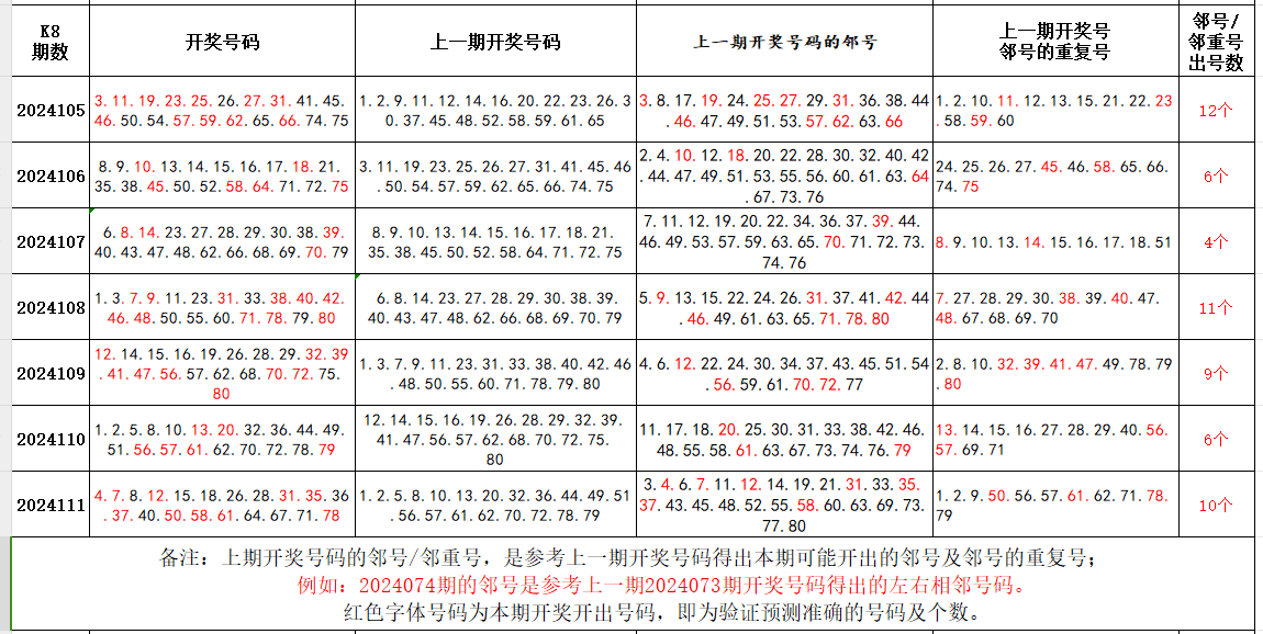 如图,红色字体为上期的邻号、邻重号在下期开出,每期开出10个左右。本期参考邻号:3.5.6.9.11.13.14.16.17.19.25.29.30.32.33.38.39.41.49.51.57.59.60.62.63.65.66.68.70.72.77.79;邻重号:7.8.27.35.36.37;重点关注:邻重号8.27.37可能出胆码。个人分析,仅供参考。