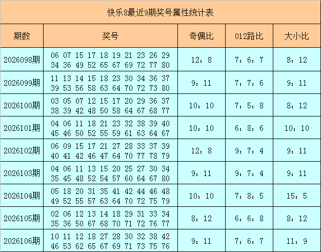 福彩快乐8第2026106期开出奖号:10 11 12 18 27 28 30 32 38 42 46 53 62 65 67 69 71 73 75 76,其中奖号奇偶比为9:11,大小比为11:9,012路比为7:6:7。
