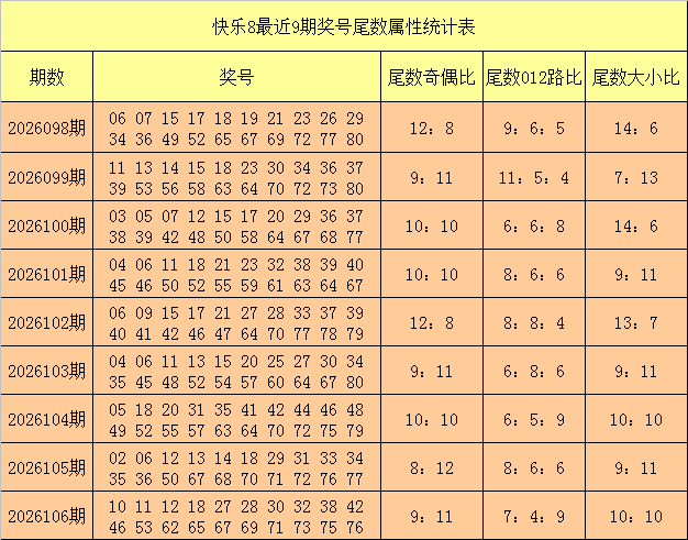 第二十位:上期开出奖号76,尾数为6,历史上该位尾数6出现了160次,最近9次尾数6出现之后其下期同位奖号尾数分别为:0→9→0→9→7→0→0→2→0,其中下期尾数012路比为7:1:1,奇偶比为3:6,大小比为3:6,本期第二十位注意0路尾数,精选号码78。