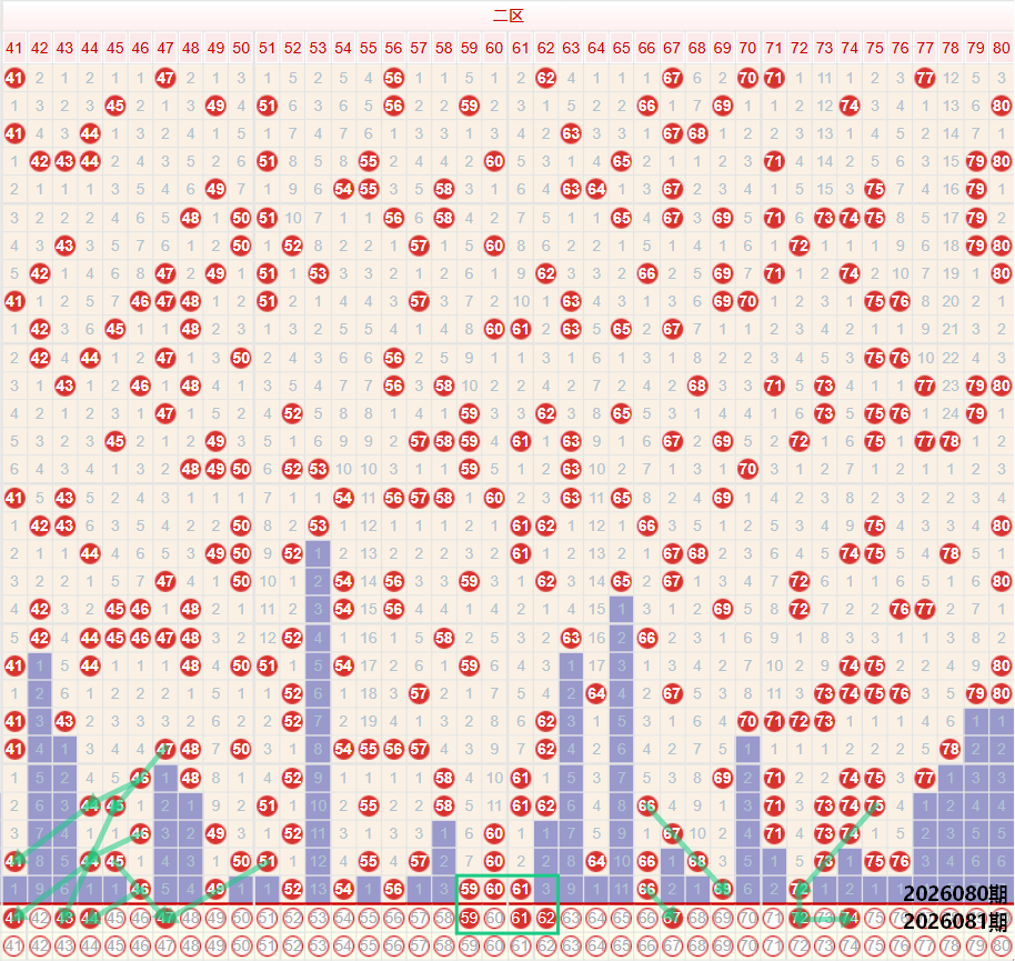 如图所示:在本期大数区的选号中注意在上期的走势中三区间开出了7枚中奖号码,落位在区间的最高位走势,目前已经保持了连续多期的高位走势,上期开出了46 49 52的同路三码,以及52 54 56偶数三码,59 60 61的三连号,落号形态相对饱满,且位置集中,本期注意位置上的便宜走势,重点考虑46 49向前的走势,号码关注41 43 44以及41 44 47的同路三码交替走势,后段位置在上期开出59 60 61的位置下方要注意继续保持相对较高的落号比例,重点考虑61 62的二连走势,以及59 61的奇数同步重号走势,四区间上期开出了4枚中奖号码,落号形态基本和三区间保持着相同的走势,开出了衔接三区间尾部的连号走势,以及66 69 72的同路三码走势,本期注意66 69 72的位置下方,近期的四区间多次出现同路交替走势,本期注意67 70 73的同路三码走势,以及在66 69 72的三码中考虑重号走势。