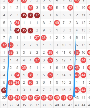 上图是福彩快乐8开奖号码走势分布图其中一部分走势图,我在上面走势图中标注出来的蓝色箭头,你们看看这个区域的数字一共有10个数字,这10个数字上期是一个都没出现,那么本期可以关注这个区域的数字出3个或者4个,那么假设这个区域的数字走热的话,那么这个区域就有可能出现连号或者跨度二组合,我最看好数字3536 3637 3839 4142;