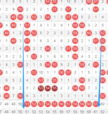 上图是福彩快乐8开奖号码走势分布图其中一部分走势图,我在上面走势图中标注出来的蓝色箭头,你们看看这个区域的数字一共有11个数字,这11个数字上期是一个都没出现,那么本期可以关注这个区域的数字出3个或者4个,那么假设这个区域的数字走热的话,那么这个区域就有可能出现连号或者跨度二组合,我最看好数字5152 5758 6061 5556;