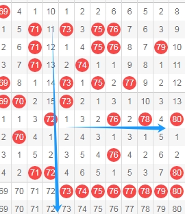 上图是福彩快乐8开奖号码走势分布图其中一部分走势图,我在上面走势图中标注出来的蓝色箭头,你们看看这个区域的数字一共有8个数字,这8个数字上期只开出了一个数字,最近3期只出现了两个数字,那么本期可以关注这个区域的数字出3个或者4个,那么假设这个区域的数字走热的话,那么这个区域就有可能出现连号或者跨度二组合,我最看好数字7576 7476 7778 7677;