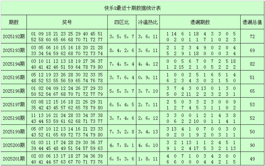 一、快乐8第2025202期奖号分析(定义:遗漏0-2期号码为热码,遗漏3-6期号码为温码,遗漏7期及7期以上号码为冷码,重码为上期开出奖号,邻码为上期没有出现,但与上期奖号差值为1的号码,例如上期开出奖号04,没有出现号码03和05,则本期03和05都为邻码,其它则为孤码。
