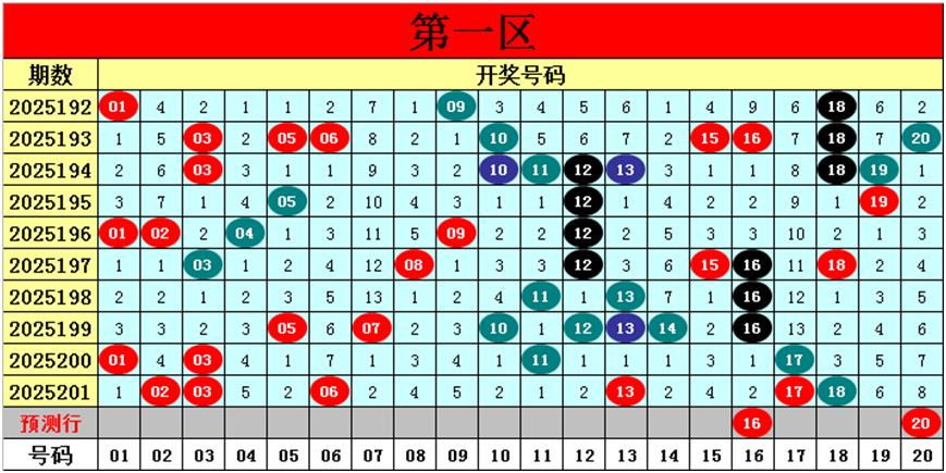 目前第一区包含14个热码:重码6个02、03、06、13、17、18,邻码6个01、05、07、12、14、16,孤码2个10、11;包含5个温码:邻码2个04、19,孤码3个08、09、15;包含1个冷码:邻码0个,孤码1个20;号码冷温热个数比为1:5:14,重号、邻码、孤码个数比为6:8:6。