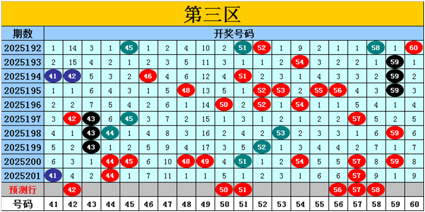 目前第三区包含11个热码:重码3个41、44、57,邻码2个43、45,孤码6个48、49、51、52、54、59;包含5个温码:邻码2个42、56,孤码3个50、53、55;包含4个冷码:邻码1个58,孤码3个46、47、60;号码冷温热个数比为4:5:11,重号、邻码、孤码个数比为3:5:12。