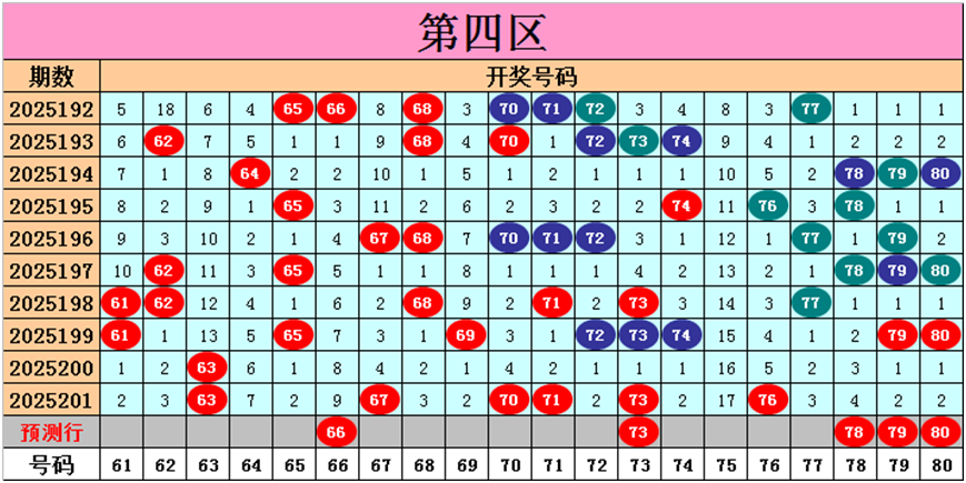 目前第四区包含13个热码:重码6个63、67、70、71、73、76,邻码3个69、72、74,孤码4个61、65、79、80;包含4个温码:邻码3个62、68、77,孤码1个78;包含3个冷码:邻码3个64、66、75,孤码0个;号码冷温热个数比为3:4:13,重号、邻码、孤码个数比为6:9:5。