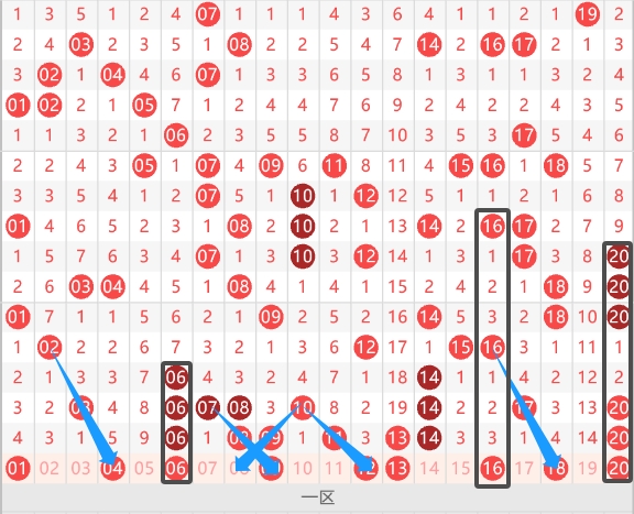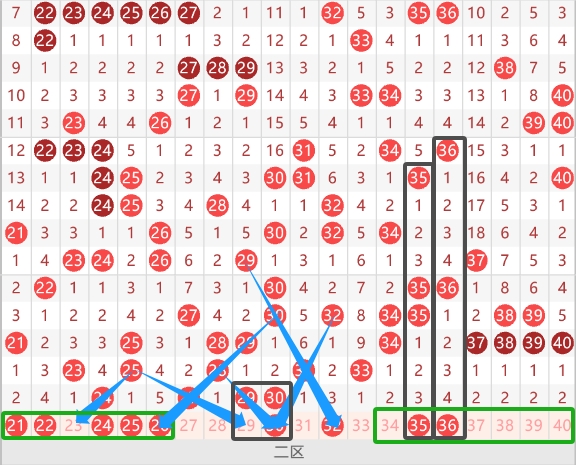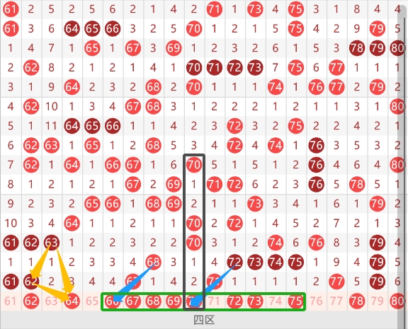 第三区间:三区现在纯纯就是扶不上墙的烂泥,连续几天走出的超级冷态让人真想骂街,但是好在这波极地风暴很快就要过去了,我们可以着手慢慢地将三区提上日程。首先在本期是关于4字头的处理,4字头连续两期断区,今日回补力度未知,所以我的建议是将它与3字头合并组合成一个新的区间进行做号。关于5字头,已经出现了回暖的前兆,我们可以以54这个支点为中心,从左右两翼寻求突破的契机。