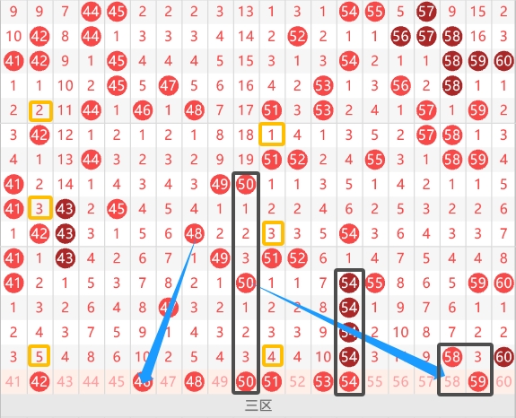 第三区间:42 46 50 53(54防一下,不建议主攻)