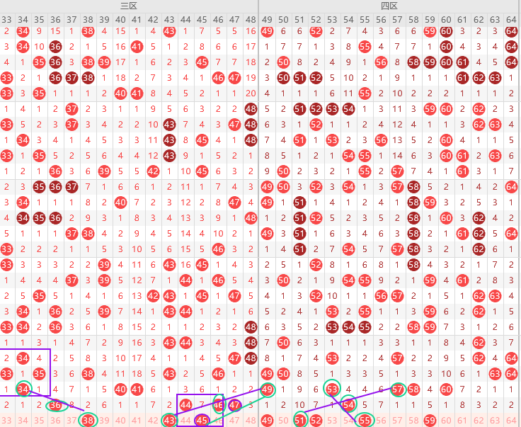 三区胆尾5尾4尾,边号35 37 43 45 48出一码,重号36 44 46 47出一码,形态上43 45 38是斜连号,上图已勾画,缩小范围,短期规律,3区爱出夹子号,所以本期45要防守,4开头走热,边号应该出在4开头,那就是43 45二出一,4尾出2期,本期重号先看44, 大概率33 34二出一,结论关注五码35 38 43 44 45防41