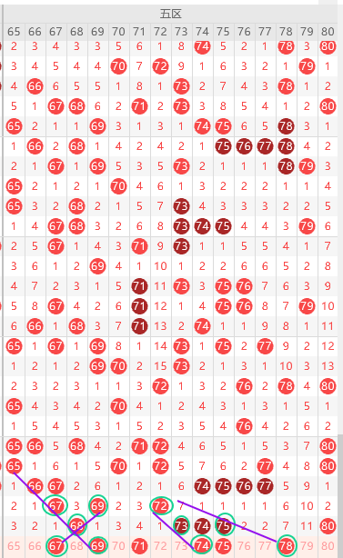 五区胆尾4尾5尾7尾,边号67 69 72 76 79出一码,重号68 73 74 75 80出一码,形态上67 69 74 78是斜连号,上图已勾画,本期重号先看75 其次74 73 68,6开头走冷趋势,本期应该最多只有一码,65 67二出一,如果75走重号,那么67更合适,结论关注五码65 67 74 75 79防71