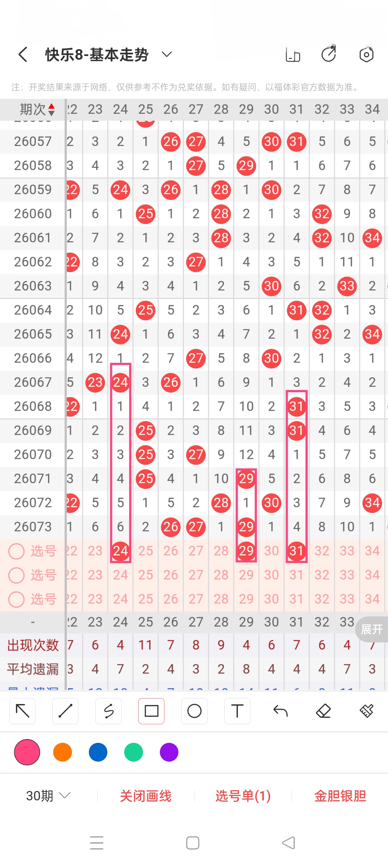 上期本区开出号码4枚,较上期对比减少3枚,近3期本区出号比例:3:7:4,出号呈增加趋势,本期看好出号6-7枚。以走势图来看,24呈上下间隔1-6的对称走势。29呈上下间隔12-1的对称走势。31呈上下间隔3-1的对称走势。本区推荐号码24、29、31