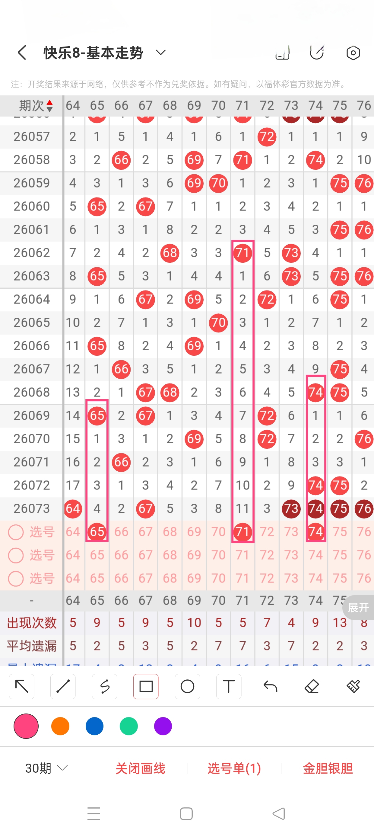 上期本区开出号码3枚,较上期对比增加5枚,近三期本区出号比对:4:3:8,出号呈减少趋势,本期看好出号3-4枚。以走势图来看,65呈上下间隔2-4的对称走势。71呈上下间隔3-11的对称走势。74呈上下间隔9-3的对称走势。本区推荐号码65、71、74